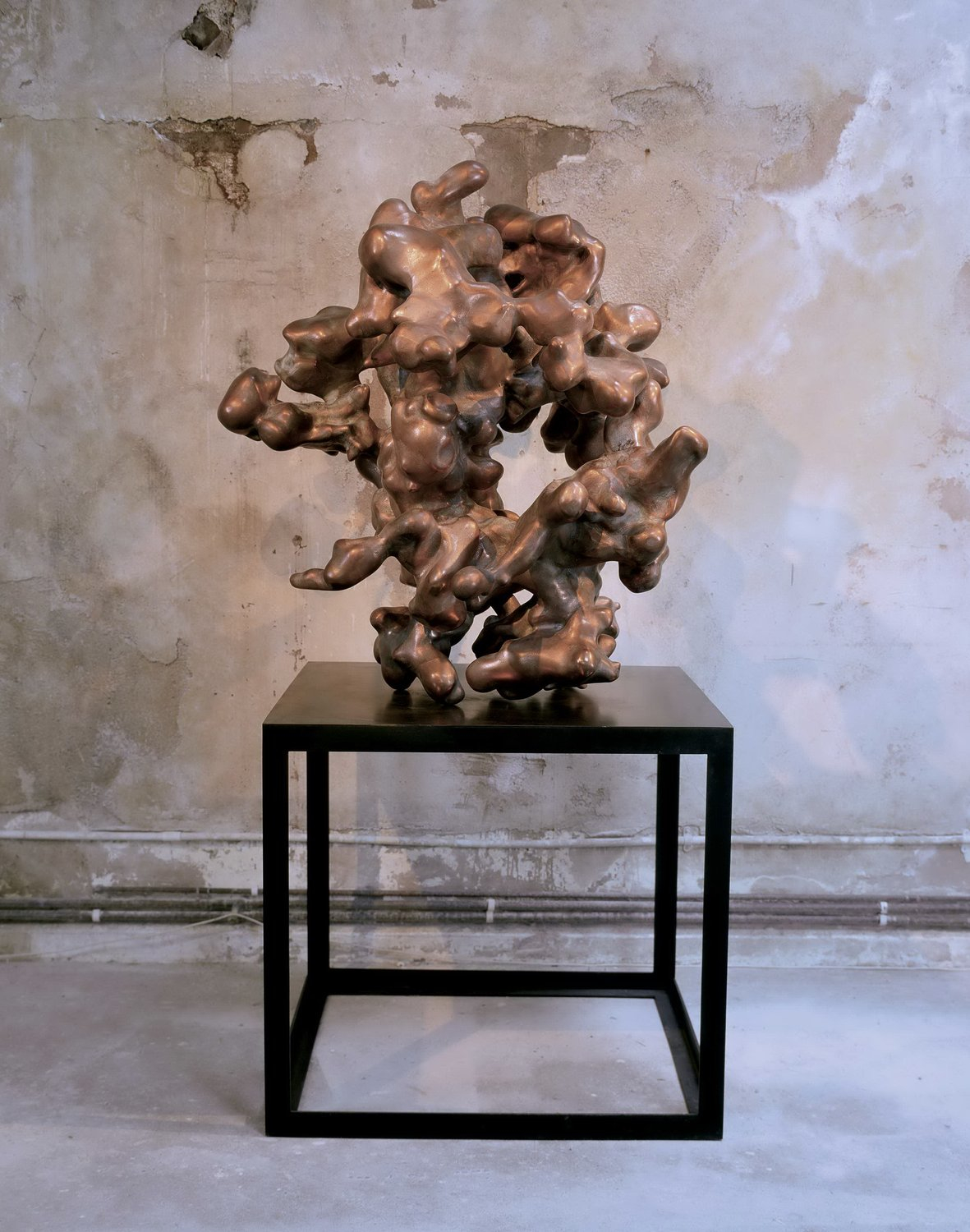 It might seem odd to talk about the "relevance" of shape, as if sculpture can be without shape, but Alex Hoda's method of creating his works questions this. He drops molten copper into water, which solidifies into shapes which look like… well, they're impossible to describe because the point is that they don't look like anything familiar (pictured left). If you imagine dozens of pelvic bones jammed together at random intervals and angles, you'll be some of the way, but the randomness is the point. This is natural sculpture, without human intervention dictating a regular shape, whereas Long has always made human intervention in nature the point.