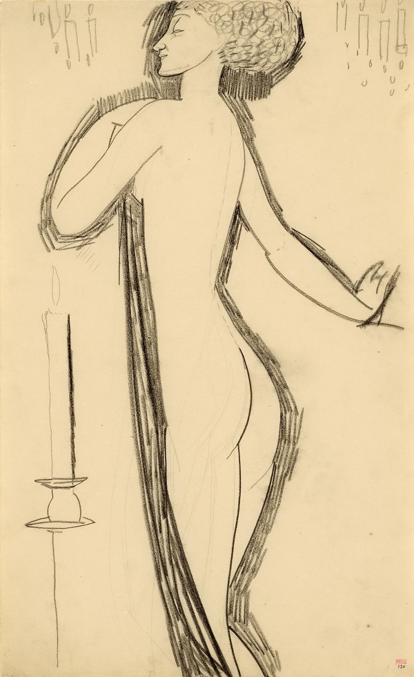 She appears again in Standing Female Nude in Profile with Lighted Candle, c1911 (Pictured left), simultaneously naturalistic and schematic, ambiguously located in space so that she appears to be at once a real woman and a painted figure, flattened to two dimensions, her posture recalling so many ancient Egyptian wall paintings. The candle seems at first incidental, or, at most, calculated to lend an atmosphere of magic and mystery, but it is essential to the uncertain nature of the image, the absence of shading heightening the sense of a two-dimensional, unreal form, while the most cursory lines beneath her elbow are enough to imply slight movement and the flickering of the candle. Even the deep shadow she casts on the wall is equivocal, and surrounding her like an aura, it begins to envelop her lower legs to become highly stylised, a graphic device more than an evocation of the effects of light.