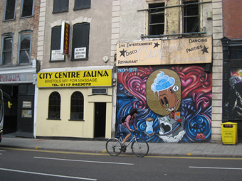 Street_grafittiThe area’s connection with entertainment goes back to the 18th century and the inglorious days of Bristol’s slave trade-driven gold rush. The neighbourhood lay on the outskirts of town beyond the reach of moral rectitude: a playground of brothels, taverns, circuses and musical theatres where merchants could exorcise the guilt of dubious business dealings. Not so long ago, when sheep and cattle were sold less than a mile away, West Country farmers would sneak up to Stokes Croft to waste a little of their livestock profits on sex and other pleasures of the flesh. Still perceived by many as a dangerous place, the street is now a major thoroughfare for commuters, few of whom are aware that this stretch of town has become a hive of cultural activity.