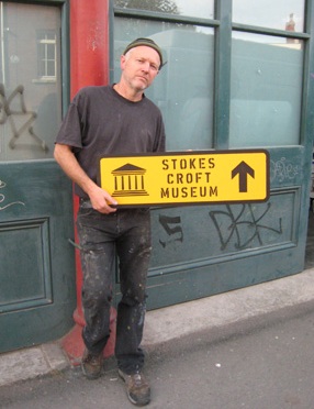 Manwithsign.MSAcross the road from Hamilton House, next to Jamaica Street Studios, one of the city’s most vibrant artists’ collectives, are the headquarters of the People’s Republic of Stokes Croft (PRSC), the eccentric but now well-established invention of Chris Chalkley (pictured right), the driving force behind the creation in Stokes Croft of what he calls an “outdoor art gallery”. Chalkley, who – perhaps fittingly – used to sell monkey puppets at festivals, is a mixture of trickster and benign dictator, as befits the ruler of a fictitious people’s republic. He is a constant irritant to the local council, part jester, part agitator, and his anarchic mono-mania has not always endeared him to others in the community. But this latter-day Situationist gets things done, promotes street art in the area, gets the homeless sweeping, gardening and painting, and was the enabler for the Museum project that was dreamt up by his collaborator Katy Bauer.