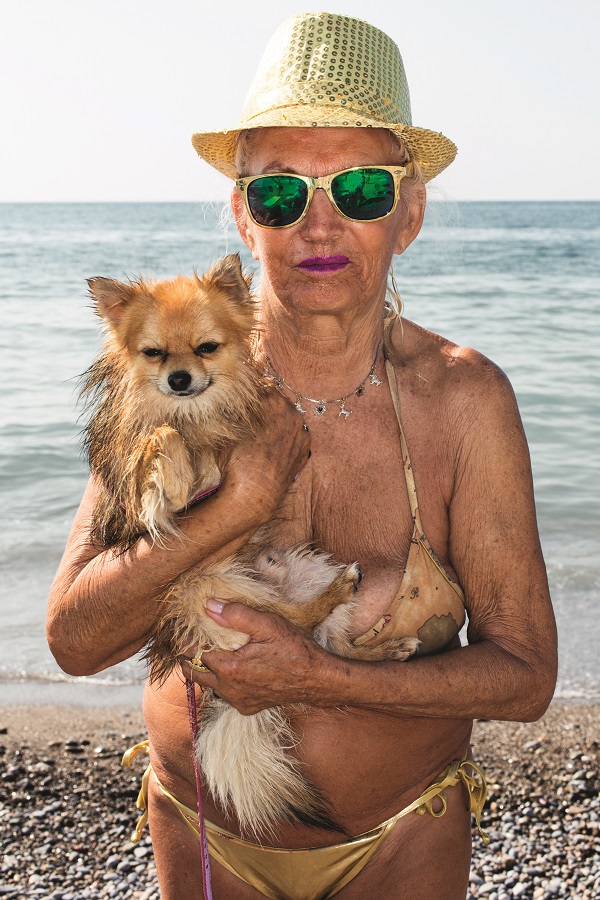 Topped by Brexit Britain now and scenes from several years back highlights include near naked men posing at Manchester Pride; dog owners, their charges all dachshunds, in Newcastle; lifesavers in Exmouth. One gallery is a big series over time of Parr’s self-portraits, rarely smiling, improbably fleshed out by the accoutrements of jokey photo studios world-wide: here Parr is next to Putin on a grey beach, there next to Lionel Messi on an empty football field, and there his face tops the shiny torso of a body-builder. It is a mini visual anthology suggestive of Parr’s many journeys (Pictured above right: Martin Parr, Online dating profile picture, Hey Saturday, London, England, 2016).