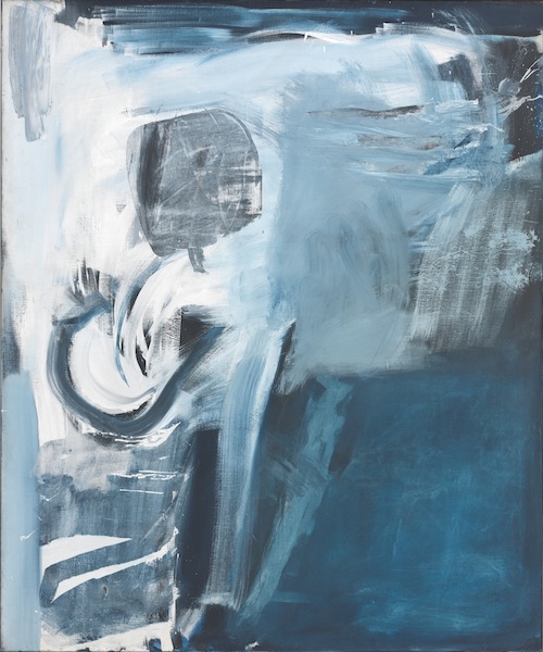Silent Coast, 1957, with its gloriously seductive blues expresses the kind of ever-changing relationship between land and sea, coast and ocean. These landscape paintings are curiously more specific, perhaps because Lanyon posited one point of view, one vantage point, before he found what he thought of as liberation, the extraordinary expanse of viewpoints as he glided over the landscape. High Wind, 1957, well indicates the turbulence that we feel when buffeted by the invisible currents of air all round us, and the dancing brushstrokes pin down into visibility just that swirling movement.