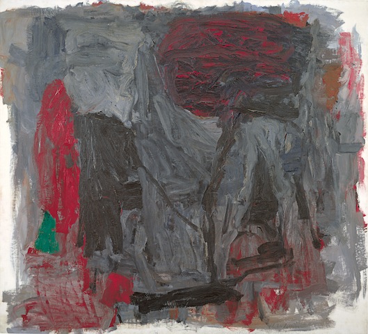 The painting which kicks off this exhibition is the large-scale Traveller III (pictured below; © The Estate of Philip Guston, courtesy Acquavella Galleries), a densely brooding mass of greys ignited by passages of red and a single lozenge of green nestling in a corner (already we see that colour scheme in place; Guston’s early abstracts are also infused with reds and pinks). The dominating shape rising up through this morass of greys could be a tornado. It could be a mushroom cloud. There’s a lot of compressed energy in those brushstrokes, but the painting feels inert. You spot inchoate Klansmen.