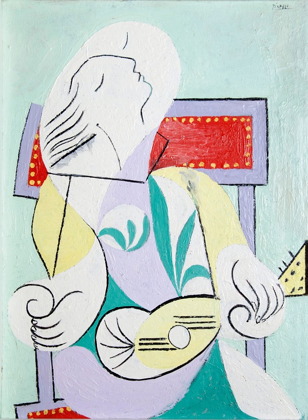 Painted in ice-cream shades punctuated with vivid red, the series of portraits made by Picasso in the early weeks of 1932 are as dreamy as love letters. His mistress Marie-Thérèse Walther – we assume it is she – lies adrift in post-coital languor, her body spread before us as a delicious and endlessly fascinating confection. But the mood shifts from picture to picture, and she appears by turns as a wisp-like erotic reverie, an imposing, moon-faced goddess, and, in a flash of humour that teeters on the edge of cruelty, a cartoonish blob of a creature with a long, upturned snout (Pictured below right: Young Woman with Mandolin)