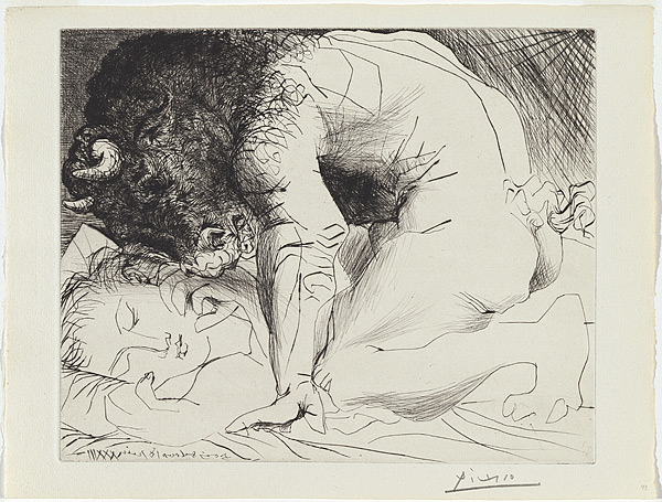 But many of the most intense phases of Picasso’s creative output can also be linked to the women in his life. Certainly Picasso seemed to renew himself with a kind of vampiric zeal during his most passionate entanglements. When Picasso embarked on the Vollard Suite he was already involved with Marie-Thérèse Walter: two years earlier Picasso had been stopped in his tracks by Walter’s classical features when he spotted her outside a Parisian department store – she was 17, he 45 and married. When the suite came to an end the relationship, with Walter having newly given birth, was already petering out (he had already taken up with Dora Maar, the Surrealist photographer who was to inspire The Weeping Woman). But Walter was to inspire many of Picasso's greatest paintings, as well as these masterful etchings.