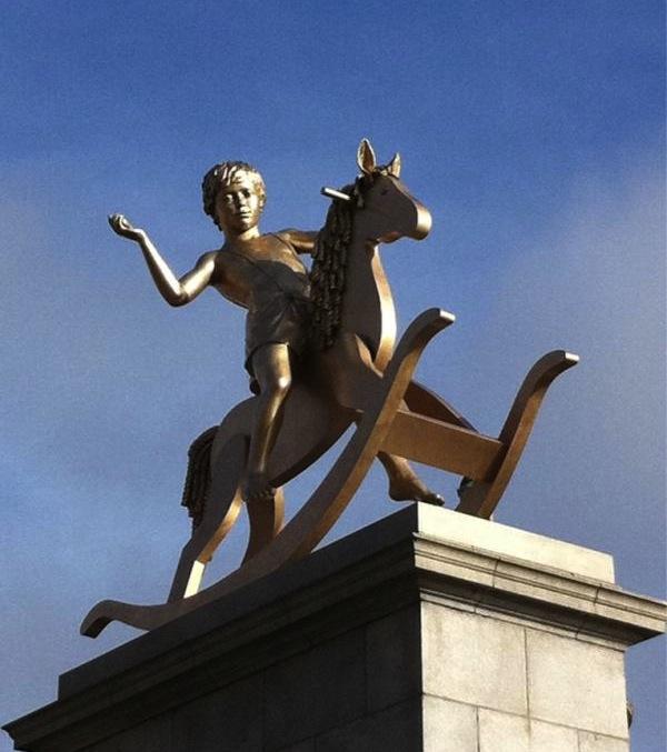 Superficially it's the very picture of innocence. A boy clings to his wooden steed, one hand clutching the neck, the other flying free. Few Fourth Plinth commissions will be more easily co-opted for official public duty. Hope, youth, the exultation of the ordinary: the state will be able to do plenty with this. Already Boris Johnson has tried to make an Olympic mascot of the boy. Joanna Lumley, who unveiled the work earlier today, hoped his gold-plating boded well for the Summer. But as with all the best public art, Elmgreen and Dragset's new sculpture might outwardly bow to its commissioners (the gilt exterior is surely a polite thank you to Louis Vuitton's contributions to the funding pot), but inwardly it's winking at the audience.