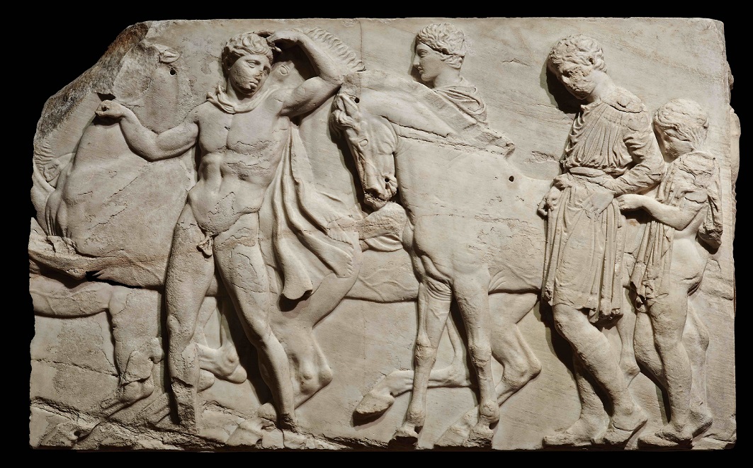 He evidently worked like the ancient Greeks too, in so far as we now know about the working methods of that star of antiquity, Pheidias (c. 480-430 BC), modelling clay and plaster for gifted artisans to replicate in stone carvings. Both Pheidias and Rodin were inspired by poetry, the former by Homer, the latter Dante. For all the apparent bravura and boldness of these humans even in divine form, they are also curiously introverted, thoughtful, introspective. There is an inner life on subtle display, defined by outward appearance. (Compare the form of The Age of Bronze, 1877 (bronze © Musée Rodin, pictured above) with the main figure of the "Unmounted youths preparing for the cavalcade", block from the north frieze of the Parthenon, c. 438-432 BC, pictured below)
