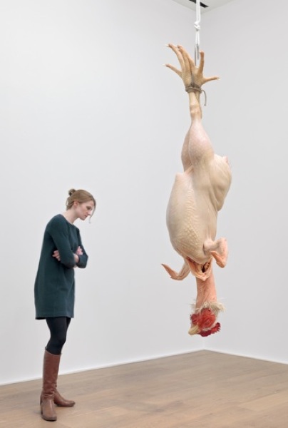 Sharing the room with her is a giant chicken (Still LIfe pictured left) plucked, eviscerated and hung upside down by its feet. Its huge scale invites comparison with the human body, but this corpse is more comic than poignant – a grotesque inviting mockery, rather than a victim arousing sympathy.