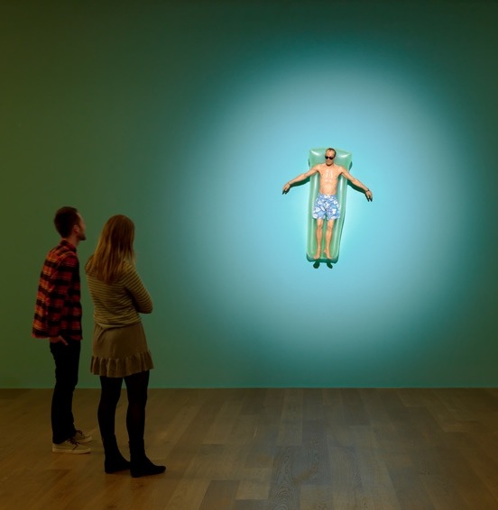 Wander into the next room and you see a man in floral trunks wearing shades, a gold medallion and a waterproof watch floating on a green lilo (Drift pictured above). Instead of drifting across a hotel pool or an expanse of sea, though, he is levitating up a sea-green wall. With his outstretched arms, suddenly this diminutive figure looks less like a bather than the crucified Christ, and the airbed becomes a mandorla.