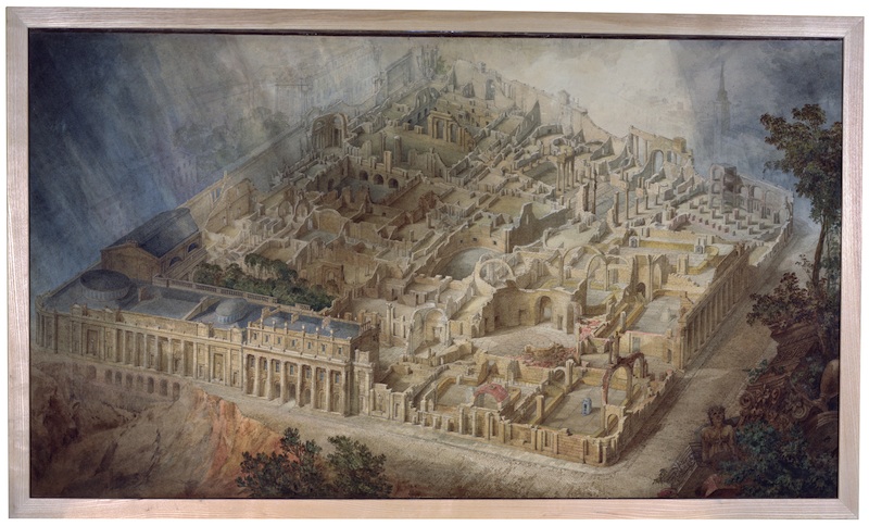The first room of Ruin Lust is a knockout. Three large-scale pictures indicate the enduring fascination that ruins have held for artists over the centuries. John Martin’s apocalyptic view of Vesuvius smothering Pompeii in a vast cloud of volcanic ash (main picture) is like a vision of Hell. The engulfing dust storm is shaped like a fiery grotto seductive yet repellent. In its fleshy recesses, the erupting volcano appears like a fire-spurting nipple, while the flames reflected in the water tinge the sea blood red, making it impossible to distinguish the actual waves from the lava swamping everything in its path. In the foreground is a straggle of traumatised people fleeing this seething maelstrom.