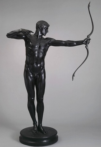 There are thoughtful and admiring tributes to the classical ideal, veering from works of art in their own right to pastiche. Among these striking figures are Hamo Thornycroft’s bronze Teucer, 1881 (pictured left) a mythological archer, the gracefully assured figure a homage to a Greek Apollo of the 5th century BC; Hiram Power’s Greek Slave, with various small scale copies in Parian, showing advances in reproductive techniques. Powers’ sculpture and John Bell’s black The American Slave, a beautiful young woman in golden chains, harked to a classic ideal – baubles for the rich, but also visible protests.