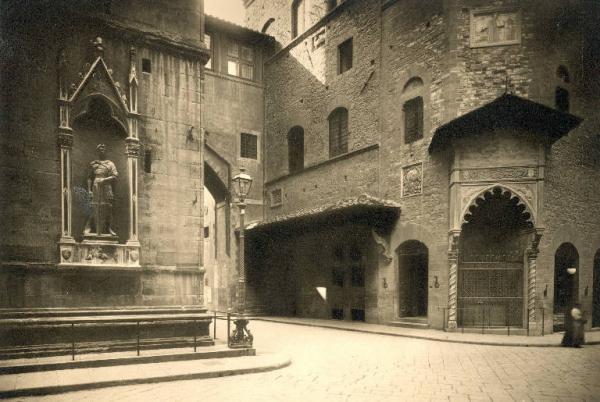 Completed in 1308, it is one of the oldest surviving structures in Florence. It largely owes its existence to millions of sheep grazing a thousand miles to the north, because the lion's share of the wool which built this palazzo came from English fleeces. A gallery - an enclosed walkway - connects it with the mighty granary, Orsanmichele. Once the wool had been beaten and washed, it was taken down to the River Arno for rinsing. So in a way these sheep were the first English pilgrims to enjoy a Florentine baptism.