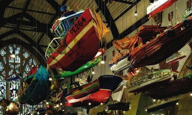 The bell is aligned with the belfry of St Mary and St Eanswythe’s Church where Hew Locke has installed a colourful flotilla of model ships. Painted primary colours and decorated with flowers, 100 model boats – skiffs, junks, clippers, brigs, barges, trawlers and lifeboats – sail down the nave (itself shaped like an upturned boat) towards the altar. The boats in the harbour attest to the fact that Folkestone still has a fishing fleet, albeit on a modest scale, and Locke’s installation celebrates our ongoing relationship with the sea; but its title, For Those in Peril on the Sea, the last line of the Royal Navy Hymn, reminds one of the dangers of embarking in small craft and brings to mind the desperate migrants who attempt to reach foreign shores in overcrowded boats.