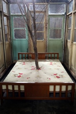 But the single most outstanding work, certainly the most powerful for me, belonged to Song Dong. In a work entitled Wisdom of the Poor (detail pictured right), he partly recreates, in deeply evocative, poetic form, the living conditions of those in Beijing who dwell in slum-like public courtyards, known as hutongs. In an attempt to try and improve their lives they “borrow” public land and build around it, careful not to break the law by actually destroying anything. One family built a makeshift bedroom over a shrub and let it grown into a tree. The tree grew through a hole in the middle of the mattress, as we see in this achingly haunting installation. It’s an unforgettable work from an artist who recently had his first major UK exhibition at the Barbican’s Curve gallery.