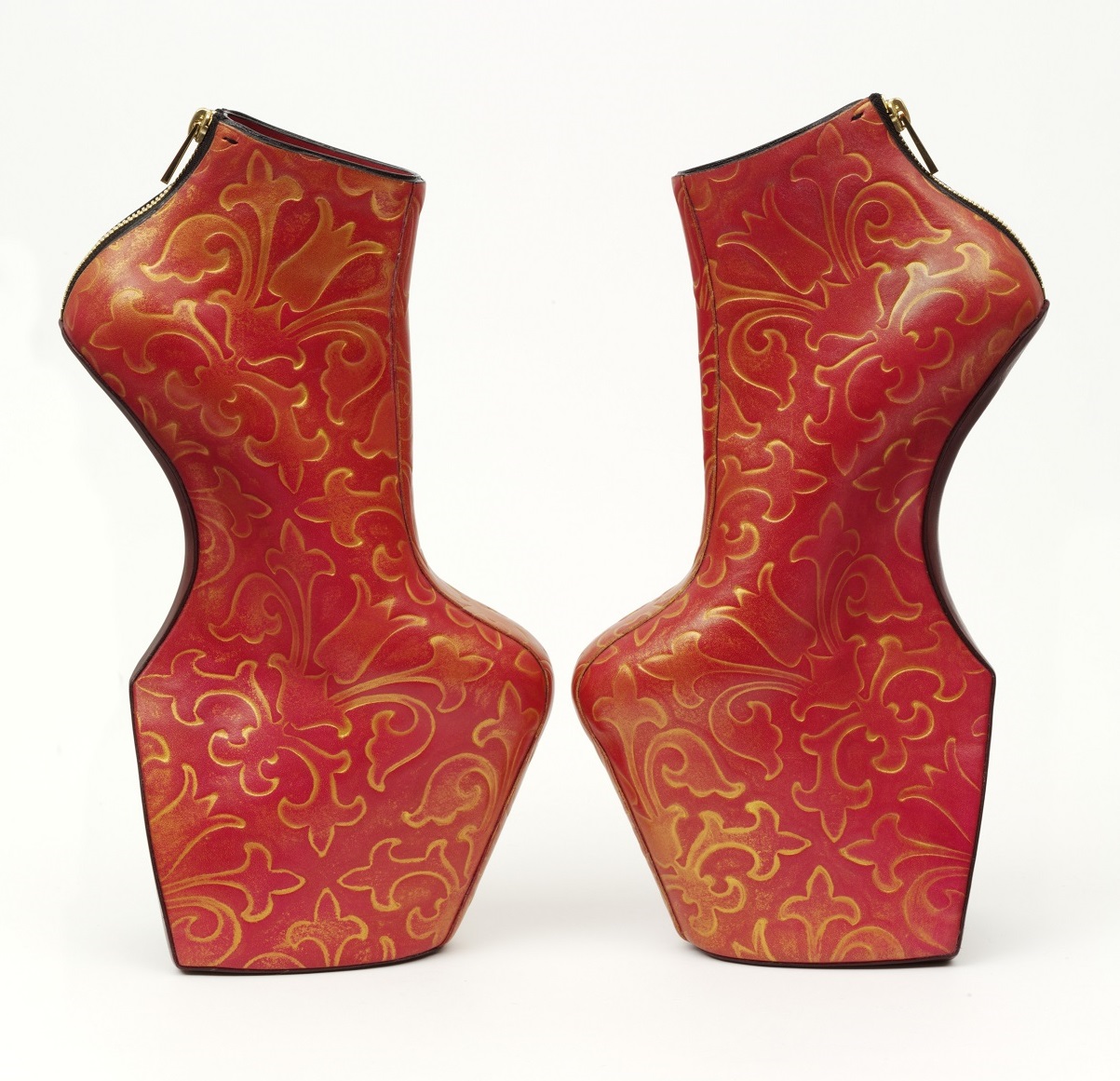 The earliest object is a sixth-century, round-bottomed stoneware jar which was buried with a grandee, while the newest encompasses such technology as Sony’s 1958 portable transistor radio, as well as the Sony Walkman of 1979, Noritaka Tatehana’s avant-garde, totally improbable heel-less shoes of 2014 (surely a version was worn by Victoria Beckham?, bottom image), not to mention a Hello Kitty rice cooker, toaster and kettle from last year in shocking pink. There are also some innovative and beautiful contemporary baskets and pottery.