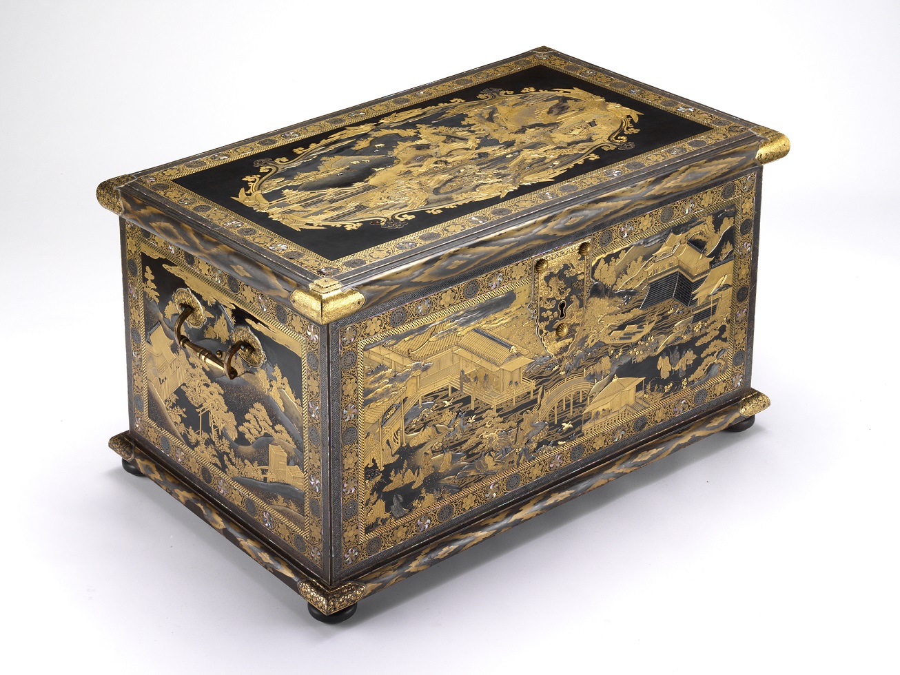 Paradoxically, what is termed the collection’s greatest treasure was made for the export market: the magnificent 17th-century Mazarin Chest (pictured above), made in Kyoto, with black lacquer, gold, silver and mother of pearl inlay, showing landscapes, mythical animals – dragons and phoenixes – and scenes from the Tale of Genji; through the Dutch East India Company, it was once owned by a French Cardinal. It symbolises, too, the encounters between East and West which had begun by the 16th century.
