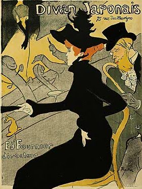 In Divan Japonais (pictured above left), 1893, the first work in which he portrayed her, all is sinuous lines and curves. Seated in the audience, Avril’s lithe figure is dressed strikingly in black. Lautrec's palette is again a reduction to three main colours, black, yellow and grey, with only a reddish-orange for Avril’s hair, and for her thinly pursed lips. But what incredible compositional flair: the arms of the two double-basses echo the raised arms of the conductor, their line following an upward curve and all framed within the elegant curve of Avril’s chest and extended arm.