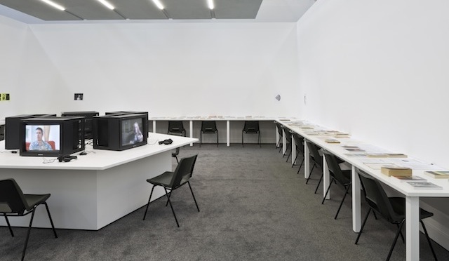 If Bonnie Camplin’s The Military Industrial Complex (Patterns) sounds ominous it certainly looks dry and theory-heavy (pictured below). At least initially. You’ll find a books on esoteric philosophy and the nature of reality beyond the bounds of physics, arranged on tables like flea market stock, a photocopier to print pages that take your fancy and five TV monitors arranged conference-like on a round table in the centre of the room. But then you pop on headphones and watch people share weird experiences and off-the-radar conspiracy theories. One woman mentions reptiles and the Rothschilds in the same breath, so you know where that might be heading. And if you’re in any doubt she then tells us that “the Nazi influence is heavy in my family”. It gets a lot weirder, but then this is really the stuff of Susan Hiller alien abduction territory, though far less aesthetically compelling. And perversely it’s all a little too “out there” to hold much sustained narrative interest.