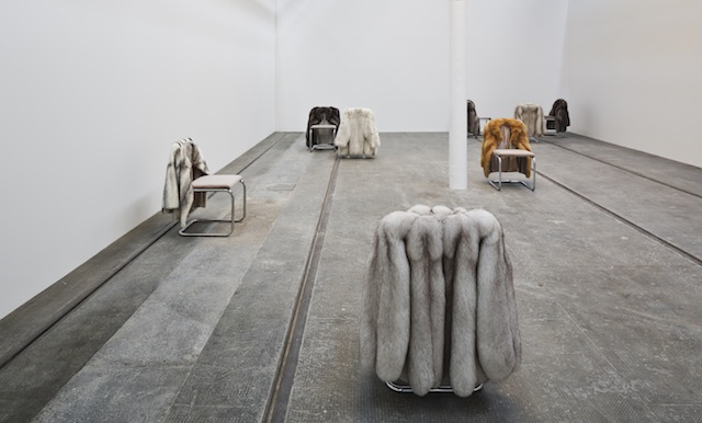 For Wermers’ display we find a group of tubular steel modernist chairs arranged in forlorn “conversational” groups, with two placed conspicuously on their own. Fur coats are draped over the backs of each chair (Infrastrukture pictured below). It looks as if a glamorous but unhappy party of identikit fashion models have taken a fag break from a Robert Palmer video. But there’s more to it. The backs of the chairs have actually been removed and the fur coats stitched in their place, so the animal pelts and the leather upholstery unite as one.