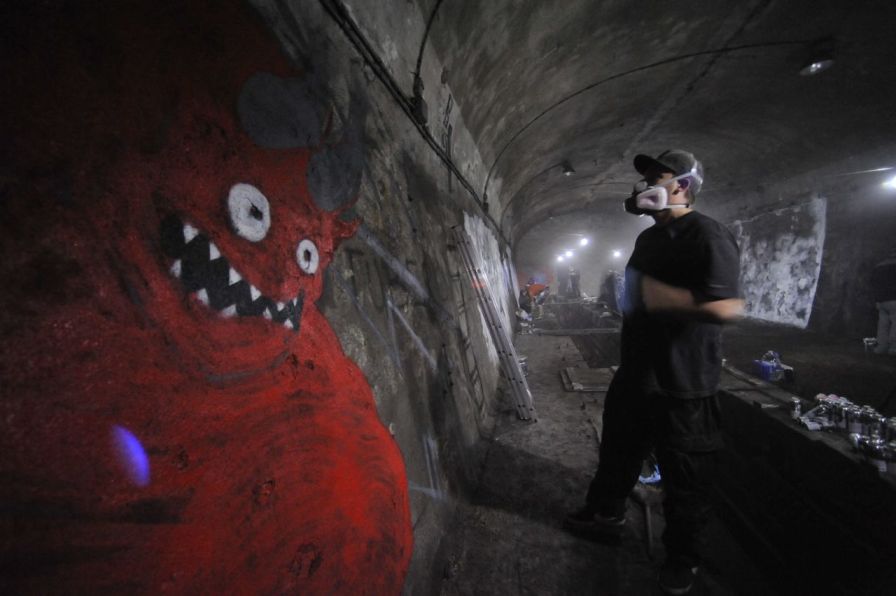 It’s eye-opening to watch a cross-section of artists address the same type of space in such different styles. At the end wall, SheOne is using the ladder to cover his vast space with his signature tag, skeletal wisps and abstract scrawls which evoke the art form’s most distant ancestry in the cave art featured in Werner Herzog’s Cave of Forgotten Dreams. Round the corner in the tunnel’s darkest space, Tristan Eaton from Brooklyn is at work on a mural of a red spear-wielding devil (pictured above right, image by Martha Cooper) which feels like a cartoon sibling of an early Renaissance fresco depicting a guardian of hell. “I thought I’d do a demon down here to protect the rest of the walls,” he says. “It’s my version of Michelangelo fresco style.”