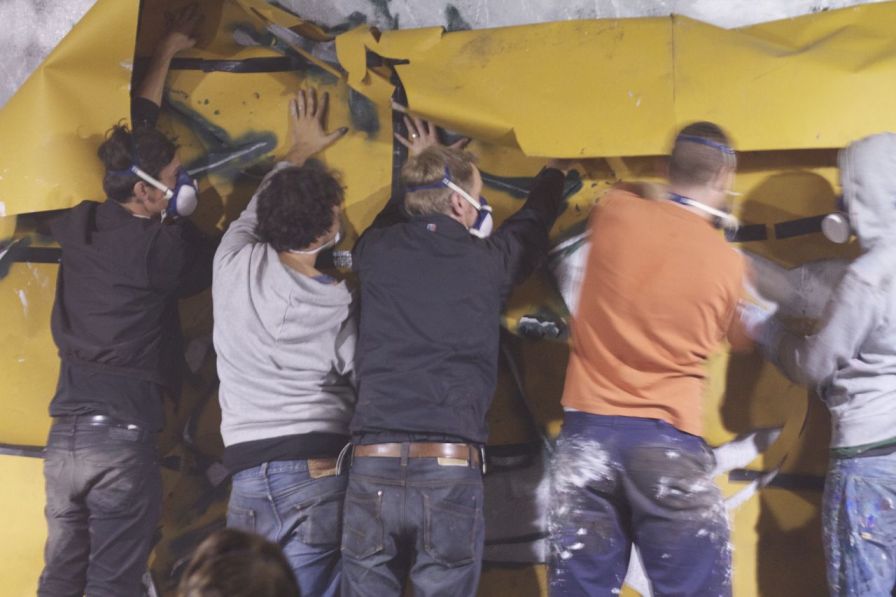 Without wishing to buy into the notion of national stereotypes, the contrast on Futura’s right flank could not be starker. The identical German twins are robotically attacking the wall with an apparently computerised knowledge of the overall plan. They are like mechanical dervishes on speed, spraying precise geometric arcs and angles as if copied from an architectural design in their heads. They work without let-up. After the first hour it has become necessary to wear the breathing masks supplied as the confined space is thick with paint particles irradiated by the arc lights hung along the length of the tunnel. Everyone feels the need to escape at regular intervals through the door and out onto the platform, down which a shaft of bright light shines from high above. The sun has risen and the trains can be seen thrumming past just down below. The rest of Paris is waking up. Tired paint-spattered figures decontaminate their lungs with cigarette smoke. Everyone, that is, apart from the Germans, who paint on and on, and don’t have time to talk. “Those German guys are absolutely insane,” says Workhorse. “They are the most hardcore and prolific guys I’ve ever met.”