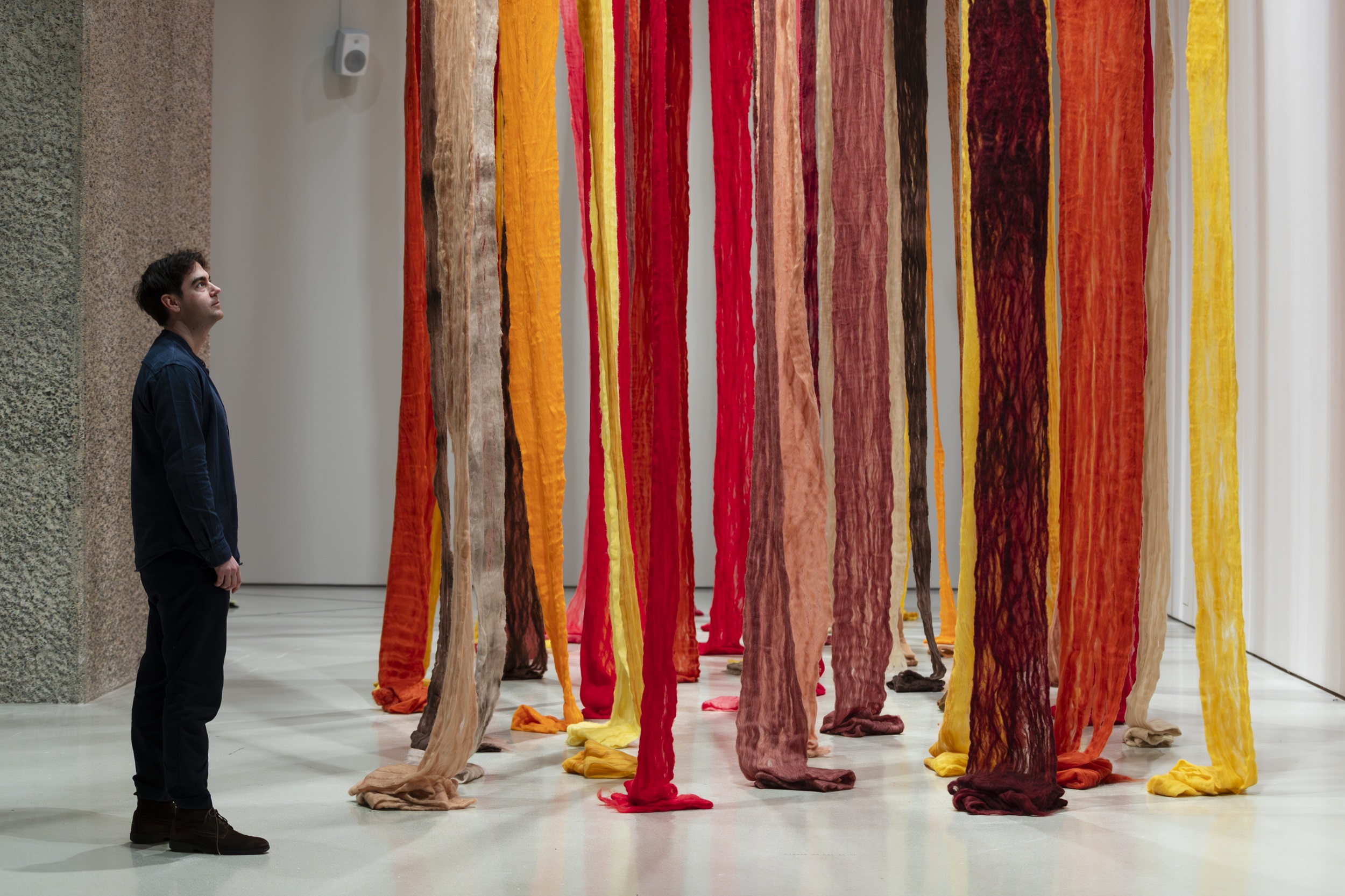 The lower gallery is dedicated to the show’s final theme, “Ancestral Threads”, highlighting the histories and traditions embodied by textiles. Yinka Shonibare's Boy on a Globe, 2008, is included for its batik-printed cotton to consider colonisation and global trade, while American artist Kevin Beasley creates “ghost” sculptures from old clothes and fabrics, shaped and set in resin, as if imbued with the people who once wore them.