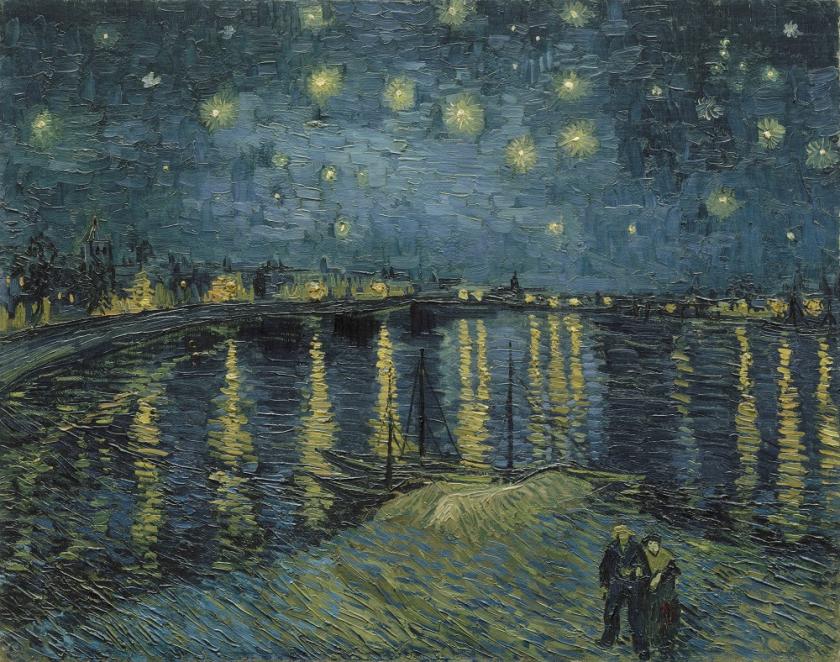 In some cases, Van Gogh kept these works with him by acquiring prints, and his 1882 painting Bleachery at Scheveningen draws heavily on Richard Parkes Bonington’s A Distant View of St-Omer, c.1823, of which Van Gogh had a print. London in the 1870s was at the heart of a thriving market for prints – black and whites, as they were known – and the black and white aesthetic, and a fashion for depicting types, emerges in his early portraits, such as Old Man with Umbrella and Watch, 1882, which though made back in The Hague is persuasively Dickensian in character. Even Van Gogh’s celebrated painting Starry Night, 1888 (main picture), with its pulsating southern sky, is treated here as a memory of London, those streaky lights reflected in the water reminiscent perhaps of gaslights reflected in the Thames.
