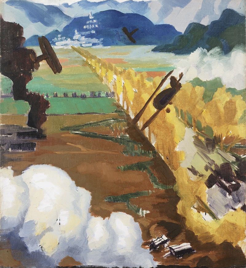Half the size but with infinite times the raw artistic power is a show-stopping depiction of a Sopwith Camel patrol attacking an Austrian aerodrome near the provincial Italian town of Sacile (pictured below right) – a raid that the artist himself took part in. Gone is the serenity of calm above the clouds and refined painterly finish. We’re plunged right into the action of an airstrike at full throttle. Just a few swift brush strokes define a plane swooping low, another pulls up out of billowing smoke from a burning building. Lines of trees so often a feature of an Italian pastoral idyll here tear through the scene with a sweeping destructive energy. Their distinctive tawny yellow colour here makes them look more like exploding bombs than part of the natural landscape. With paint on wooden board alone, Carline recreates a sequence of aerial warfare as visceral and immersive as any in Apocalypse Now.