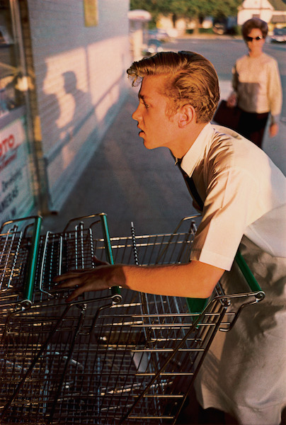 In Untitled, 1965 (Memphis, Tennessee) (pictured above right), the important detail is the golden light catching the boy’s blond quiff, face, shirt and arm as he shunts a line of shopping trollies through a supermarket door with great concentration. Behind him, out of focus, is an approaching shopper. She has a walk-on role, except that in the shadows cast on the supermarket wall, the roles are reversed. She appears closer and dwarves his hunched form. The joke is that their shadows fit together as neatly as jigsaw pieces.