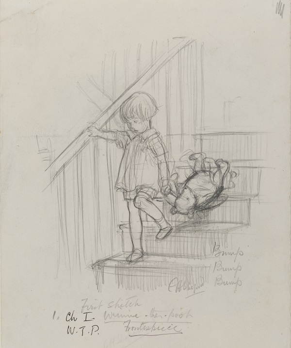 The triumph, though, is the wealth of original drawings: Shepard brings the animals to life, somehow creating life-like creatures without blurring the original nursery toys. He certainly collaborated with Milne, and the partnership is an outstanding example of a successful working relationship, a marriage of work and image. The drawings somehow, magically, look effortless. But in fact they are a masterclass in the alliance between firm outline and the improvisation of the sketch, and we can happily compare the original to the published version. The quivering line, apparently just arrested – Christopher Robin’s hair, his shirt, the stair carpet, the striations of the bark of a tree, the fuzzy outlines of Pooh’s fur, the spikes of Eeyore’s mane, Piglet’s snug green coat, Tigger’s stripes – all underline with understated skill the actual physical solidity of the characters, and the atmosphere of the woods, the trees, small groves, the expanse of sky. This exhibition shows us that genius EH Shepard working out how to make Pooh’s world tangible, visible, real. One can almost feel the wind, the texture of the grassy ground. The make-believe becomes believable.