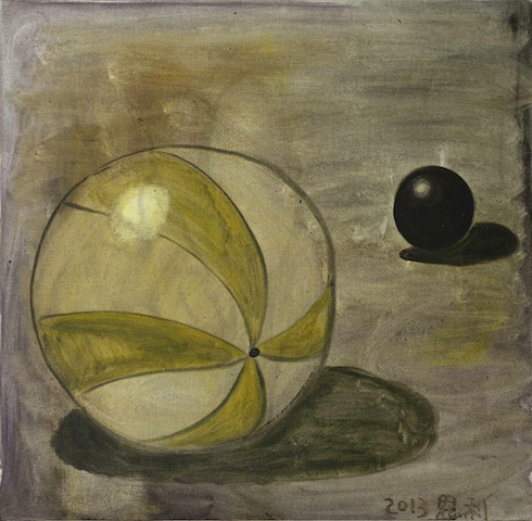 Outside the box, one finds Zhang’s paintings also have a kind of rangy spaciousness to them. They are huge, and he seems obsessed by ropes, nets and mysterious trussed-up packages, like the ones in The Box (above left) and The Package. One smaller painting is called Melancholy (pictured right), but before I look at the title I look at the painting for a long time. It features two balls, one big beach ball in white and yellow, the other a smaller black ball that looks like dense, heavy matter (whether it's much smaller or simply further away is difficult to tell). One thinks of a threatening presence, small but full of menacing intent, waiting, knowing that the bigger ball is just a big softy who is easily deflated.