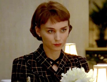 GRAHAM FULLER: The dominant pattern in Carol is check [pictured right, Rooney Mara], though not for Carol herself. I know some of the male characters have check on their clothes, but I wondered if the criss-cross bars in Therese's and Abby's outfits were intended to symbolise entrapment?