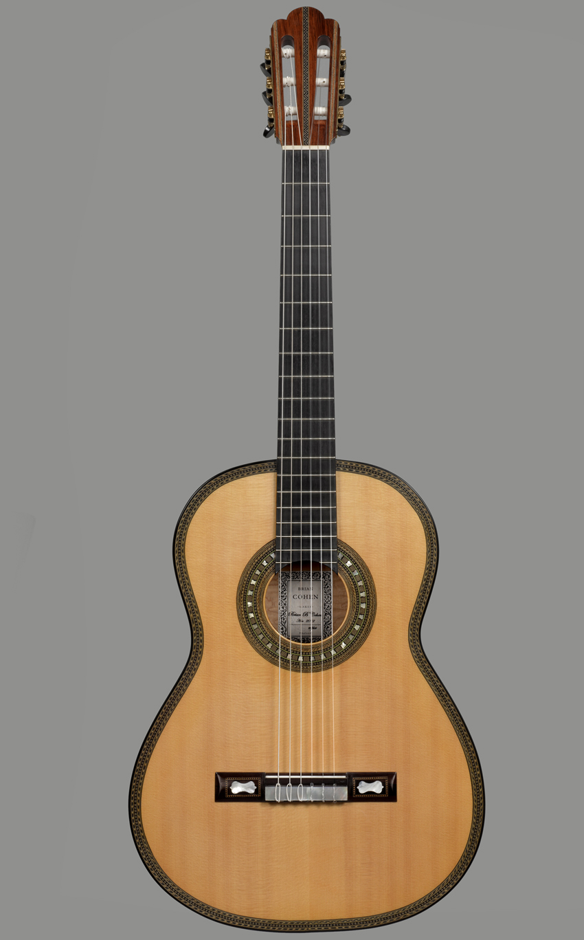Among the instruments hanging in his workshop upstairs awaiting attention is Julian Bream's first-ever concert guitar, a Martin instrument which the 13-year-old Bream played at Cheltenham Town Hall in 1947. Cohen, who once restored the guitar for auction at Sotheby's, later bought it from Bream himself. Cohen got to know Bream, one of the greatest champions the classical guitar has ever had, after the guitarist approached him in 1991 to ask if he could make him a copy of a 1940 guitar by the renowned German maker Hermann Hauser, which Bream then had on loan. Over the next six years, Cohen made eight guitars for Bream, "all refinements of this same one," and found himself involved in an exacting process of learning and discovery.